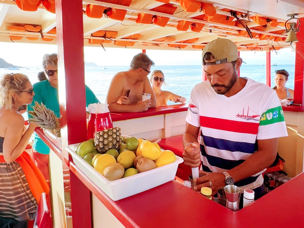 Nossas escunas dispõem de um bar central dedicado, com um cardápio de drinks e bebidas variadas, assim como mesas e assentos para todos.